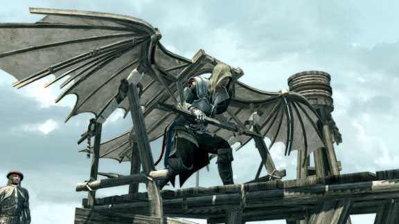 Gameplay has dramatically changed in AC2 since part 1. Now, there are over a hundred ways to go about your mission not only because, as was part 1, its a open world game, but also the myriad of weapons under you can wield against the bad guys. You now get a second hidden blade which you can taint with poison, a small pistol, smoke bombs, oh and you can even throw money to distract people. To get around the game, you still do the awesome free runs on rooftops and on the streets of Italy the same way you did back in AC1. The game also has special action sequences as well, from driving a carriage to flying Leonardo da Vinci’s ornithopter.