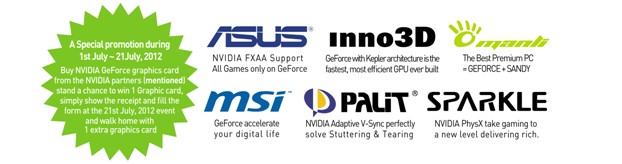 Buy NVIDIA GeForce graphics card from the NVIDIA partners (Asus, Inno3D, Omanli, MSI, Palit, Sparkle) stand a chance to win 1 Graphic card, simply show the receipt and fill the form at the 21st July, 2012 event and walk home with 1 extra graphics card.